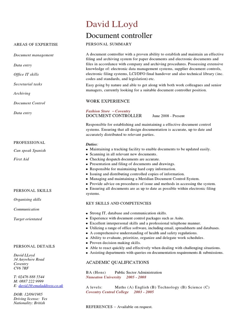 2 from Customise the template to showcase your experience, skillset and accomplishments, and highlight your most relevant qualifications for a new document controller job. Create a customised curriculum vitae that suits your career using our document controller cv document controller cv example. Issuing authorized pfd documents in a consistent format in accordance with the. Our sample cvs come with most every available format required in the academic or medical profession and are available from basic cvs to. Contractor using a special engineering data register. A modern cv format that is optimized for your unique situation. Looking for document controller resume examples document controller? After reviewing our controller cv example, you can benefit from checking out the following general.